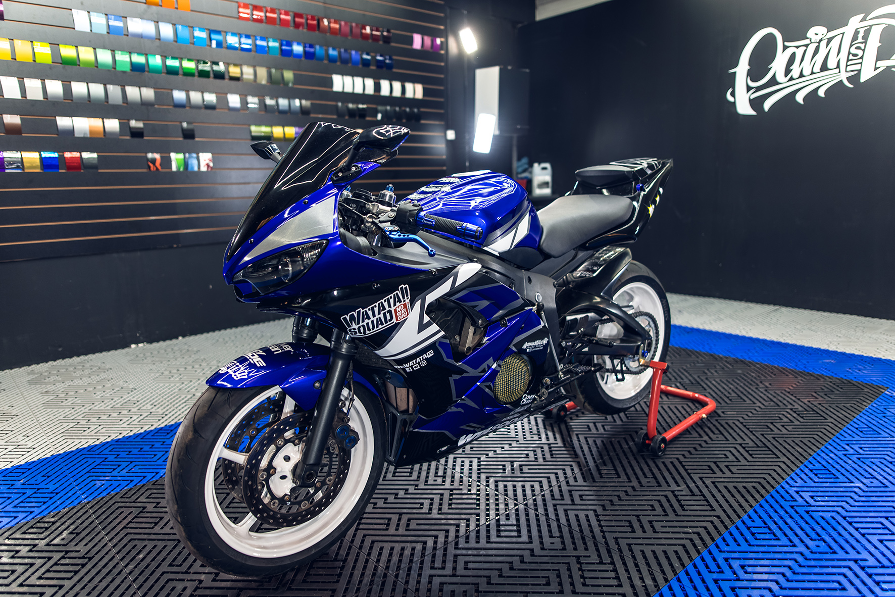 On retrouve sur ce Blue YAMAHA YZF-R6 un de mes design sous mon blase Yamastars GD dans un esprit très corporate YAMAHA mais toujours avec la pointe 90’s et une pose total covering par Cover & Clean.